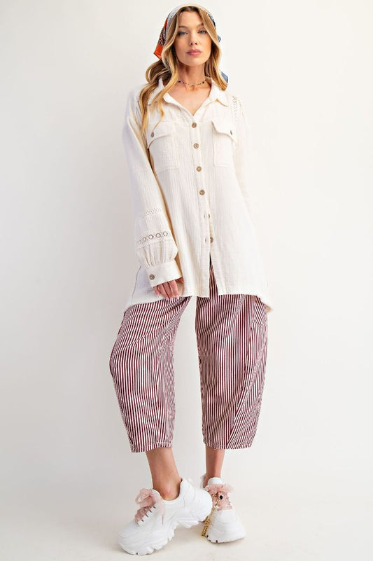 K29 Soft Gauze Tunic Length Button Front Crochet Inset Top -Ecru