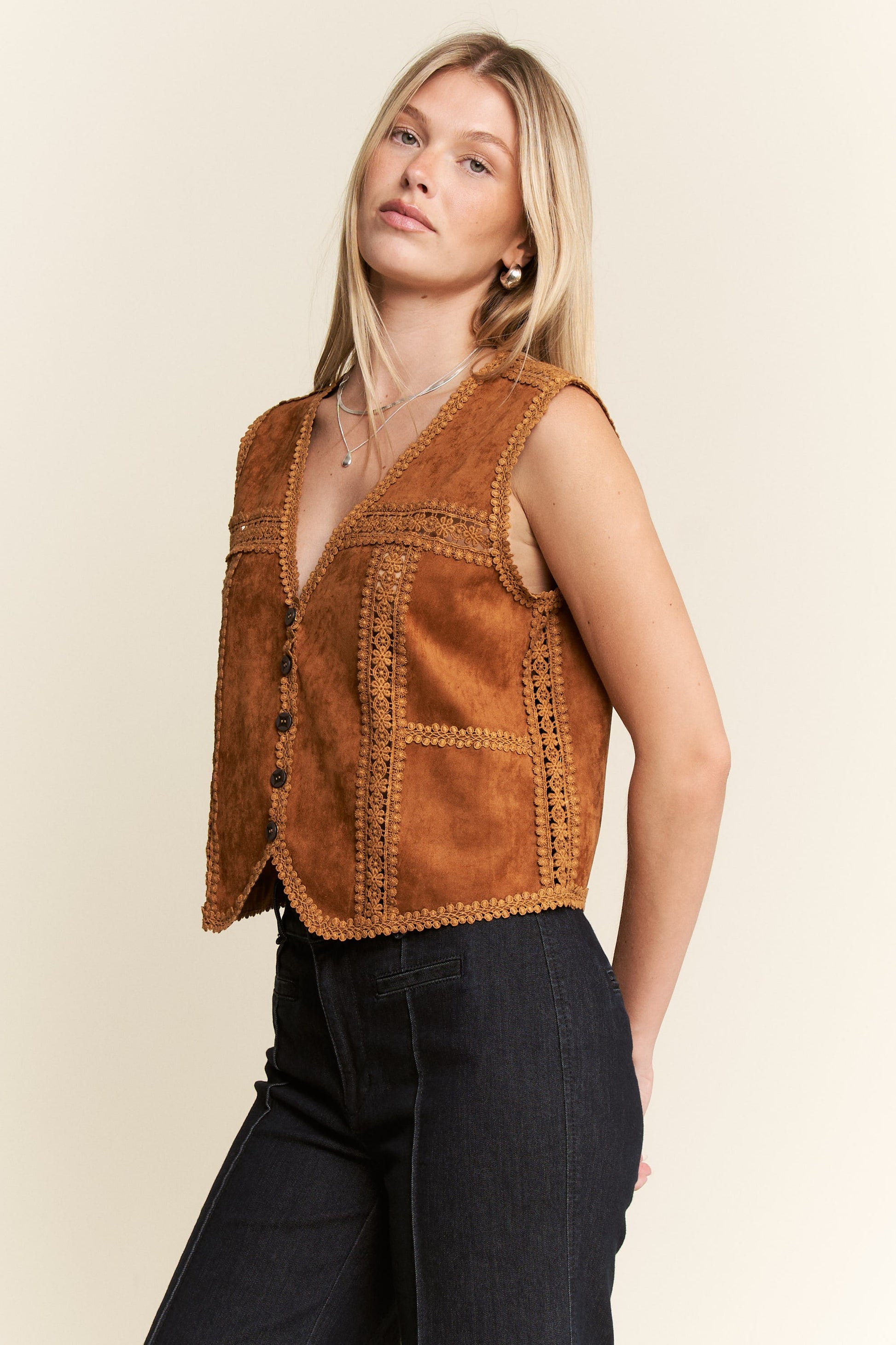 This boho-inspired suede vest brings effortless Western charm to any wardrobe. Crafted in soft camel suede with delicate lace trim detailing, it's designed for layering over your favorite pieces. The relaxed silhouette flatters plus-size frames while maintaining that coveted bohemian aesthetic. Perfect for creating dimension in your outfit, whether you're dressing up for an evening out or keeping it casual during the day. A versatile essential that bridges the gap between laid-back comfort and polished style.