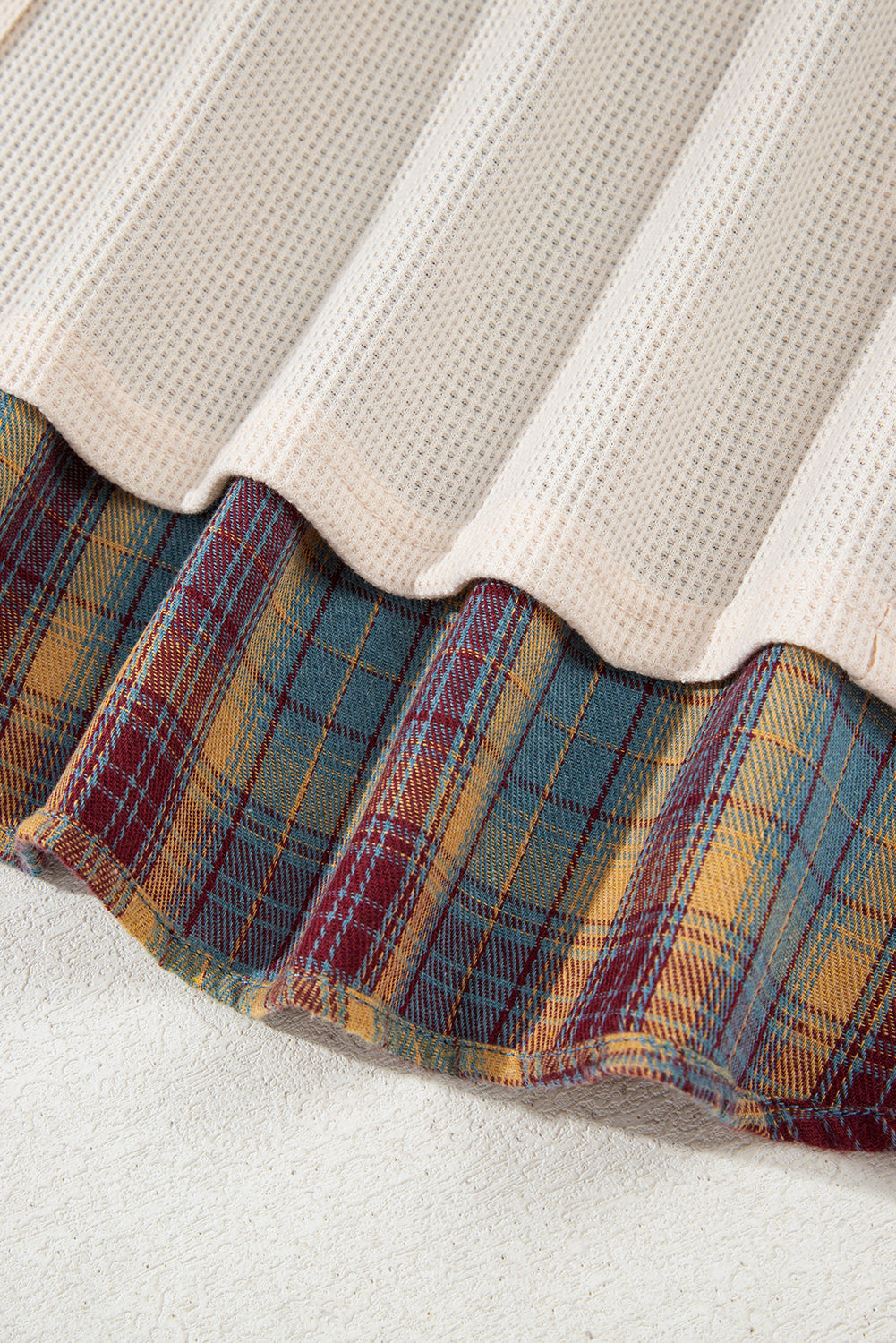 This sophisticated henley pullover combines textural waffle knit with an artfully mixed color block and plaid patchwork design. The relaxed pullover silhouette offers comfortable everyday wear without compromising on style. Thoughtfully constructed with varied fabric panels, this top creates visual interest through its intentional pattern mixing. The henley neckline adds a classic touch that grounds the contemporary aesthetic. Designed for inclusive sizing, this piece adapts to various body types while maintaining its modern appeal and versatile layering potential.